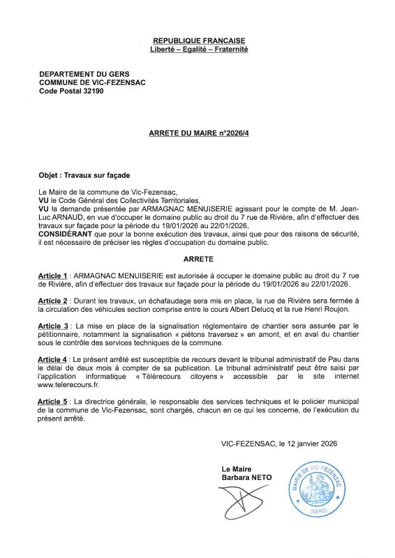 12-01-2026 - Arrêté n°2026/4 - Travaux sur façade ( rue du Rivière)