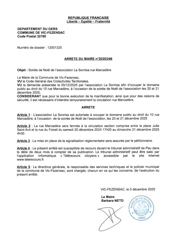 05-12-2025 - Arrêté n°2025/246 - Soirée de Noël (rue Marcadère)