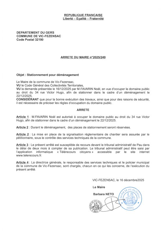 16-12-2025 - Arrêté n°2025/249 - Stationnement pour déménagement (rue Victor Hugo)