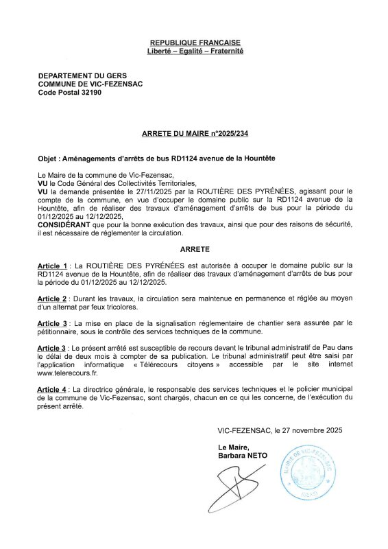 27-11-2025 - Arrêté n°2025/234 - Aménagement arrêts de bus (avenue de La Hountête)