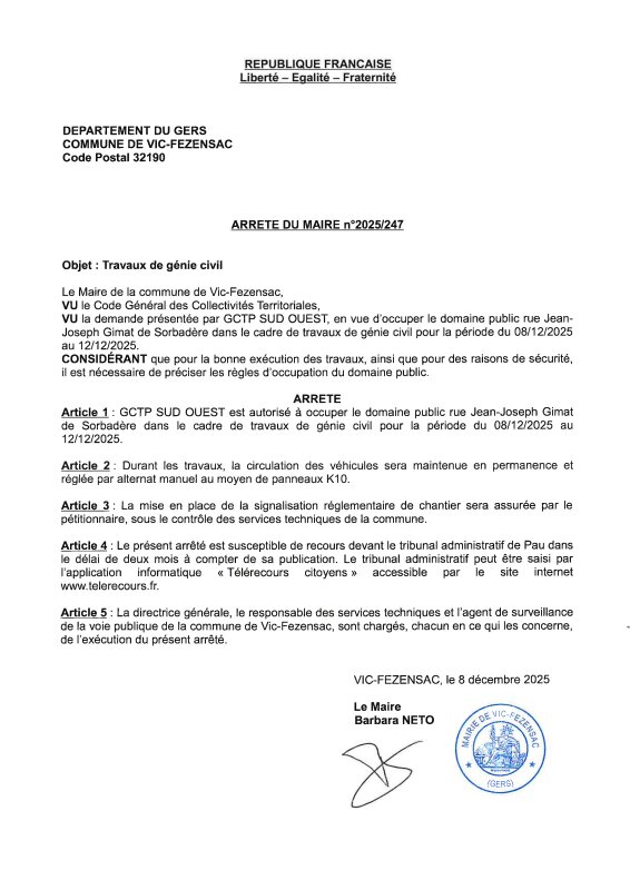08-12-2025- Arrêté n°2025/247 - Travaux de génie civil (rue Jj Gimat de Sorbadère)