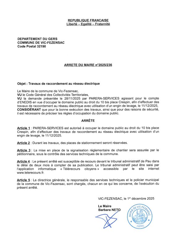 01-12-2025 - Arrêté n°2025/236 - Travaux de raccordement au réseau électrique (place Crespin)