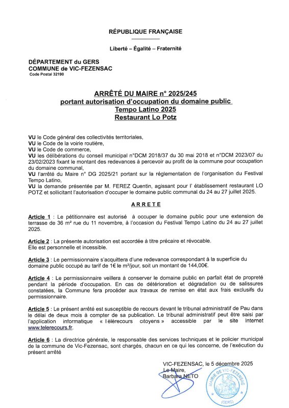 05-12-2025 - Arrêté n°2025/245 - Occupation du domaine public TEMPO LATINO