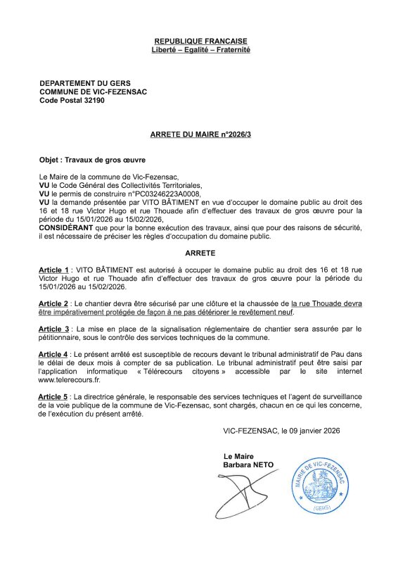 09-01-2026 - Arrêté n°2026/3 - Travaux de gros œuvre (rue Victor Hugo et rue Thouade)