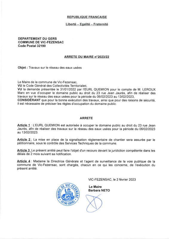 03-02-2023 - Arrêté n°2023/22 - Travaux sur le réseau des eaux usées (Rue Jean Jaurès)