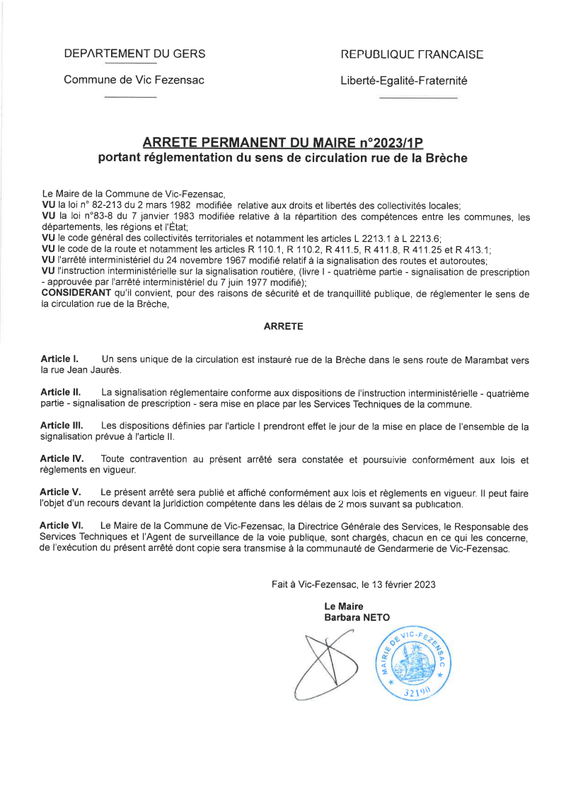 15-02-2023 - Arrêté permanent n°2023/1P portant réglementation du sens de circulation rue de la Brèche