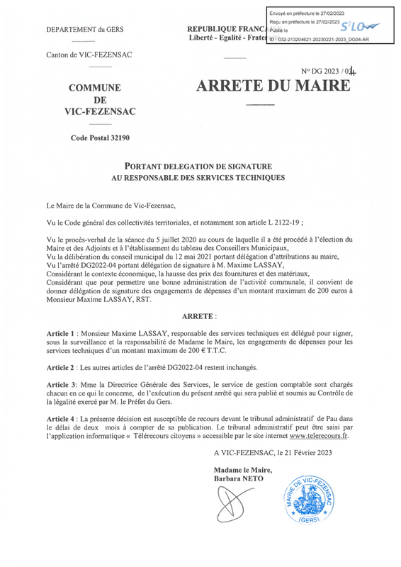 28-02-2023 - Arrêté n°2023/DG04 portant délégation de signature au Responsable des Services Techniques