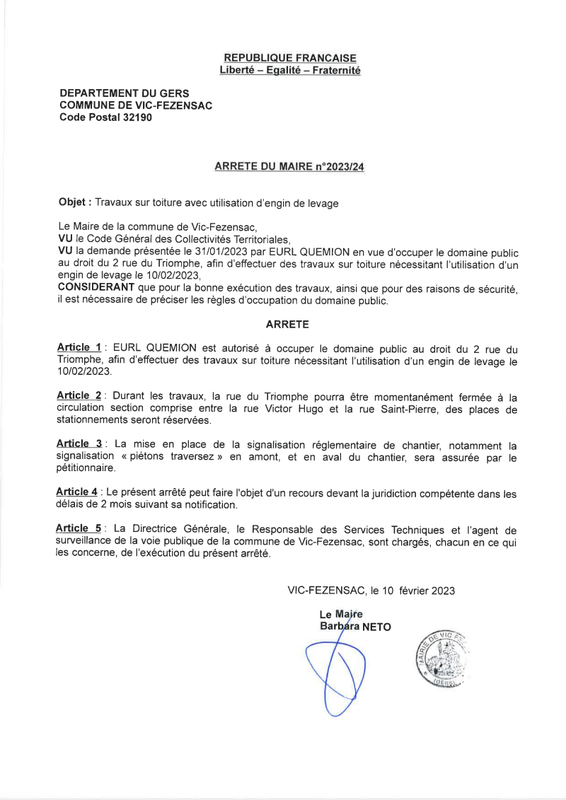10-02-2023 - Arrête n°2023/24 - Travaux sur toiture avec utilisation d'engin de levage (rue du Triomphe)