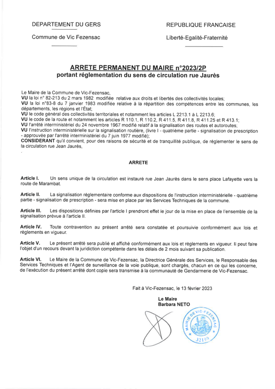 15-02-2023 - Arrêté permanent n°2023/2P portant réglementation du sens de circulation rue Jean Jaurès