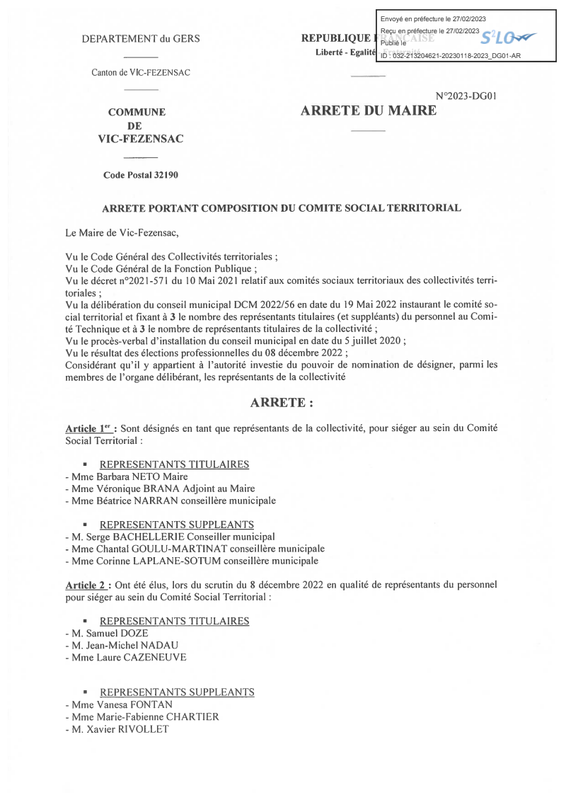 28-02-2023 - Arrêté n°2023/DG01 portant composition du Comité Social Territorial
