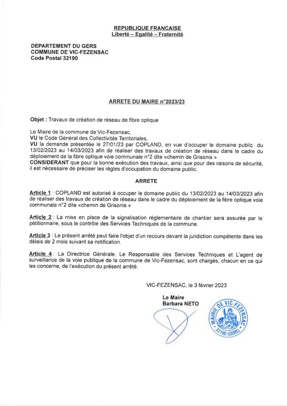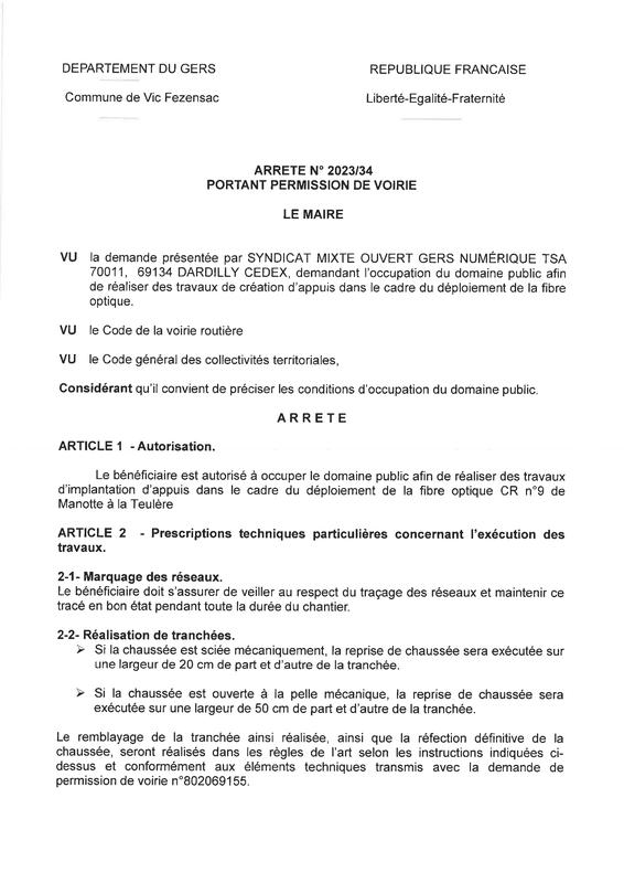 09-03-2023 - Arrêté n°2023/34 portant permission de voirie (Gers Numérique)