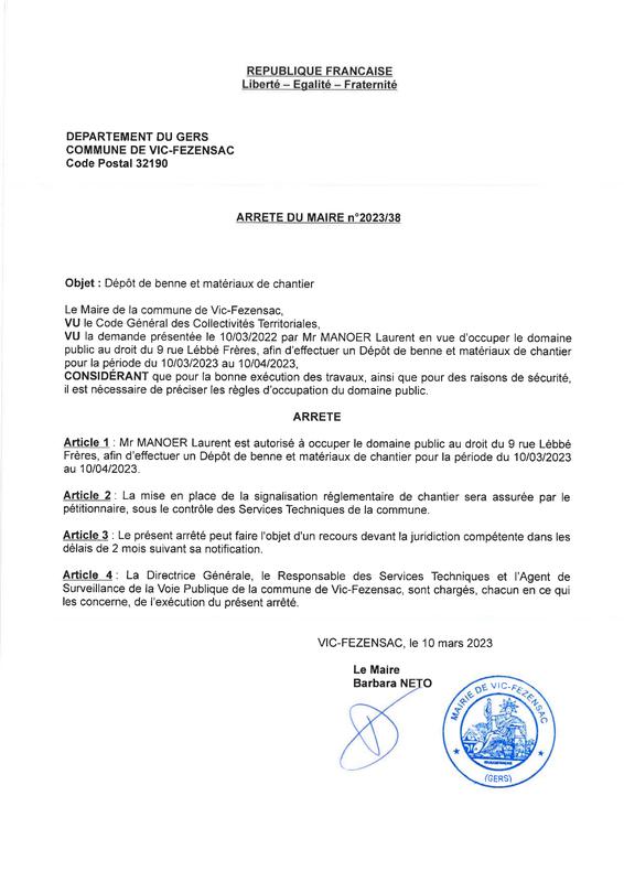 10-03-2023 - Arrêté n°2023/38 - Dépôt de benne et matériaux de chantier (rue Lébbé Frères)