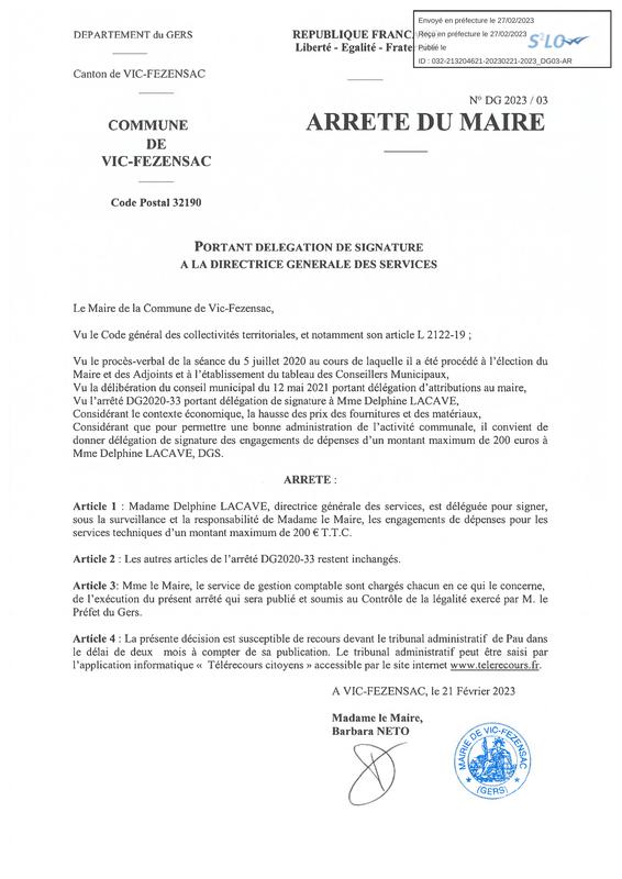 28-02-2023 - Arrêté n°2023/DG03 portant délégation de signature à la Directrice Générale des Services