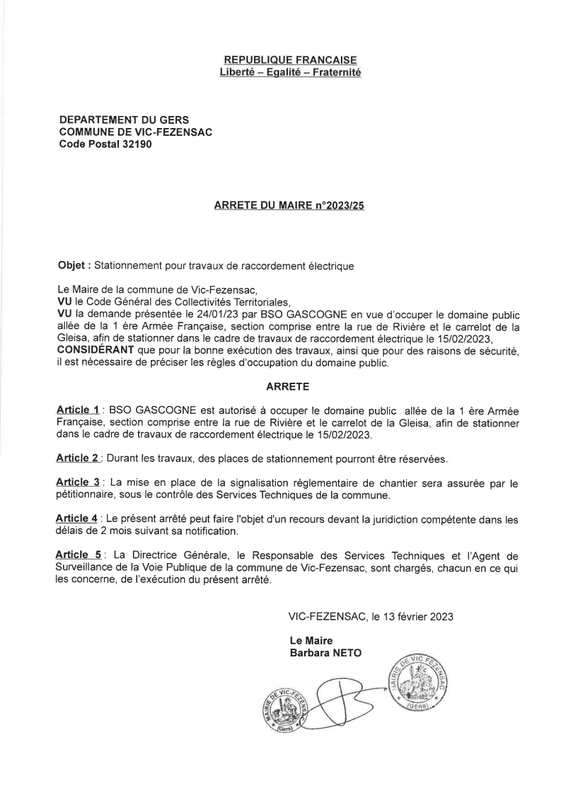 14-02-2023 - Arrêté n°2023/25 - Stationnement pour travaux de raccordement électrique