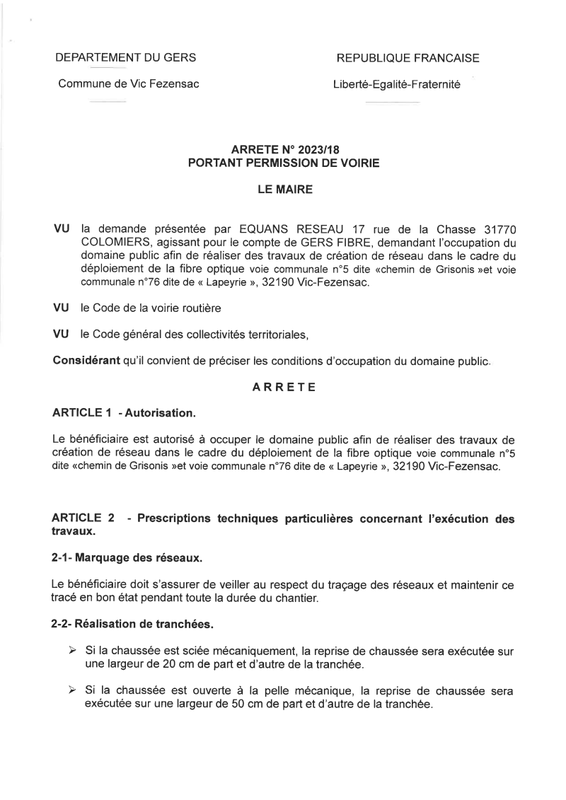 03-02-2023 - Arrêté n°2023/18 portant permission de voirie (Chemins De Grisonis et Lapeyrie)