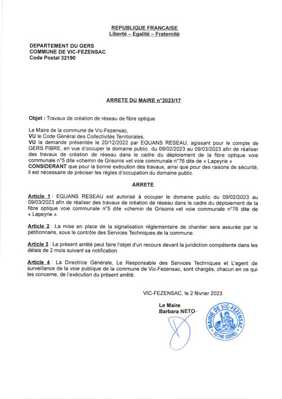 03-02-2023 - Arrêté n°2023/17 - Travaux de création de réseau de fibre optique (Chemins de Grisonis et Lapeyrie)