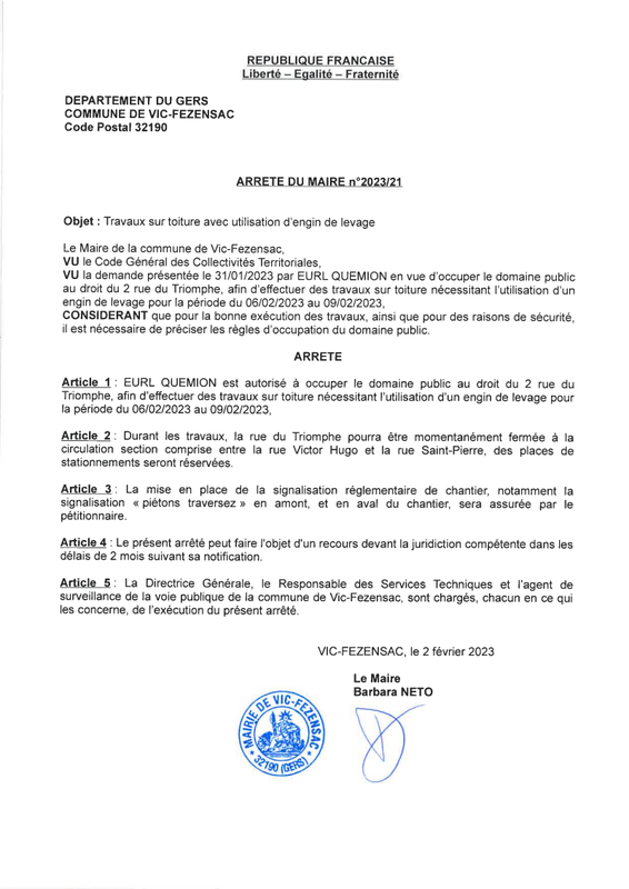 03-02-2023 - Arrêté n°2023/21 - Travaux sur toiture avec utilisation d'engin de levage (Rue Du Triomphe)