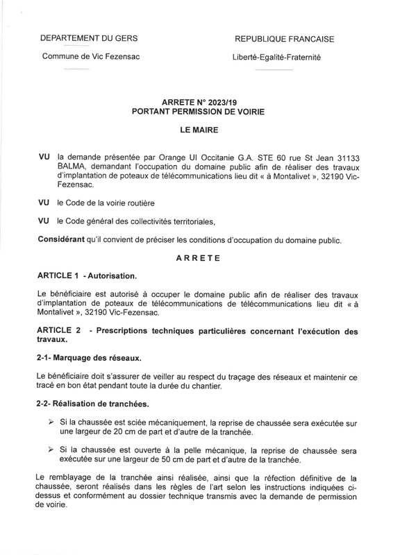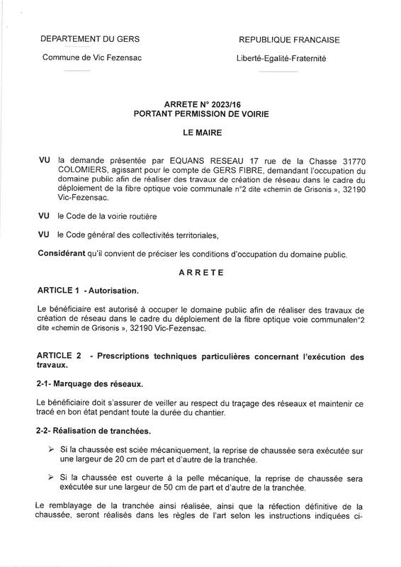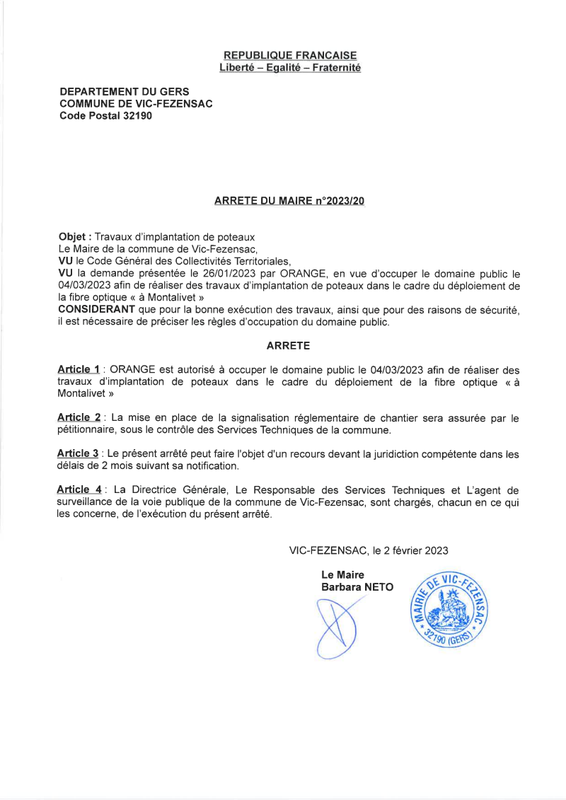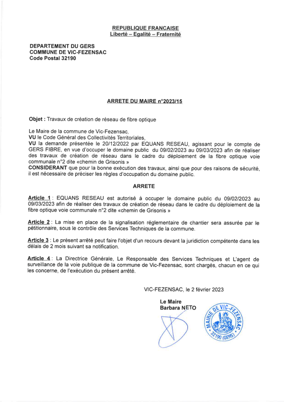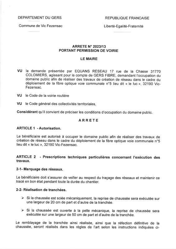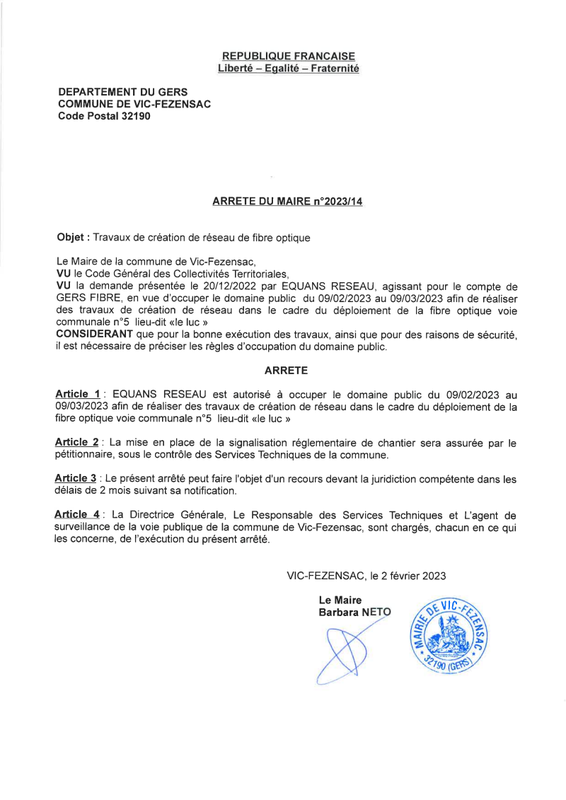 03-02-2023 - Arrêté n°2023/14 - Travaux de création de réseau de fibre optique