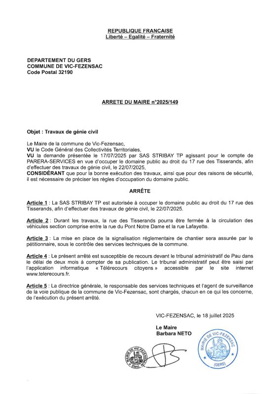 18-07-2025 - Arrêté n°2025/149 - Travaux de génie civil (rue des Tisserands)