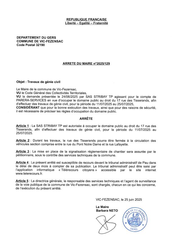 25-06-2025 - Arrêté n°2025/129 - Travaux de génie civil (rue des Tisserands)