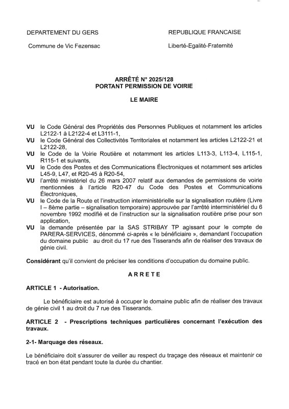 25-06-2025 - Arrêté n°2025/128 - Portant permission de voirie - Travaux de raccordement électrique (rue des Tisserands)