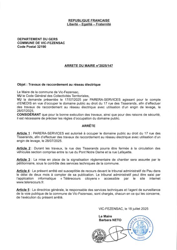 18-07-2025 - Arrêté n°2025/147 - Travaux de raccordement au réseau électrique (rue des Tisserands)