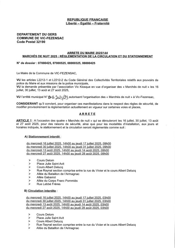 10-07-2025 - Arrêté n°2025/144 - réglementation de la circulation et du stationnement (Marchés de nuit)