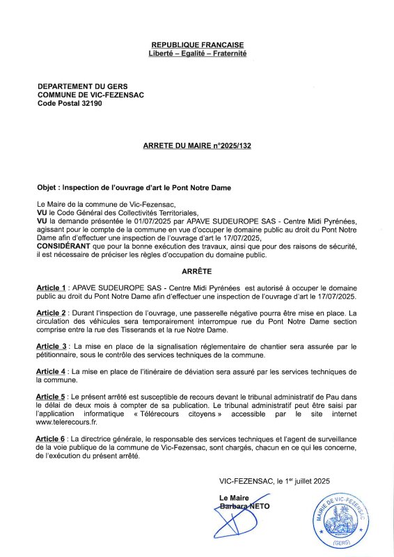 01-07-2025 - Arrêté n°2025-132 - Inspection de l'ouvrage d'art (Pont Notre Dame)