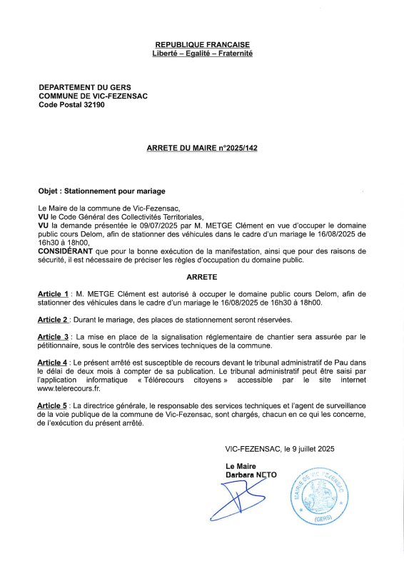 09-07-2025 - Arrêté n°2025/142 - Stationnement pour mariage (cours Delom)
