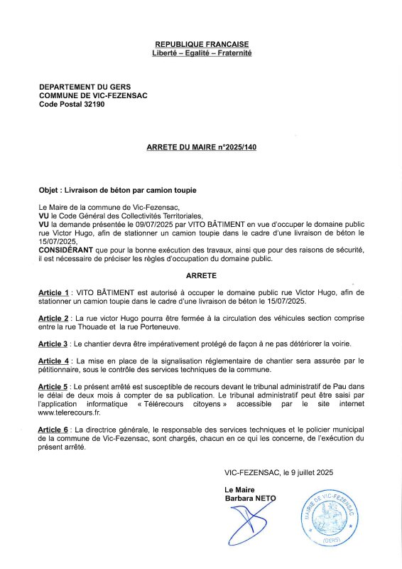 09-07-2025 - Arrêté n°2025/140 - Livraison de béton par camion toupie (rue Victor Hugo)