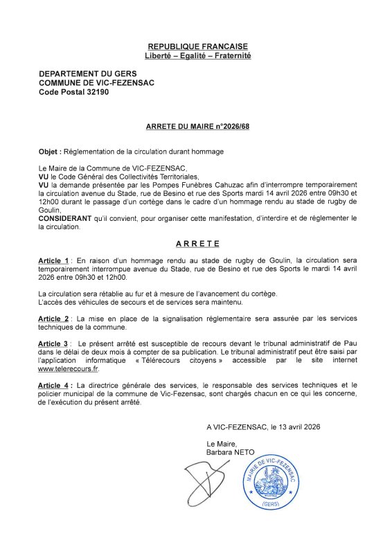 13-04-2026 - Arrêté n°2026/68 - Règlementation de circulation avenue du Stade le 14/04/2026