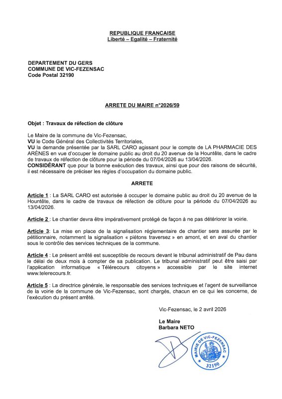 02-04-2026 - Arrêté n°2026/59 - Travaux de réfection de clôture (avenue de la Hountête)