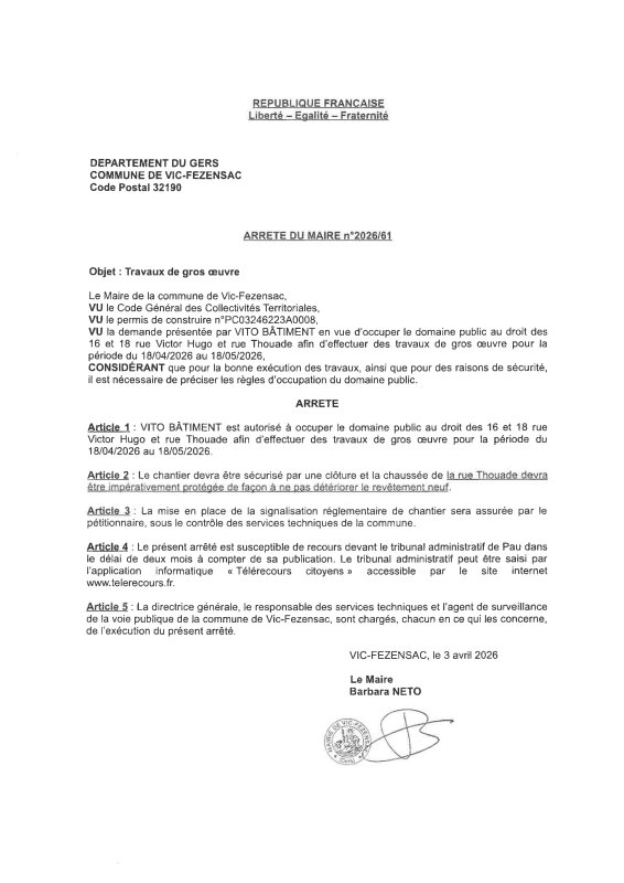 03-04-2026 - Arrêté n°2026/61 Vito Bâtiment - Travaux de gros œuvre (rue Victor Hugo et rue Thouade)