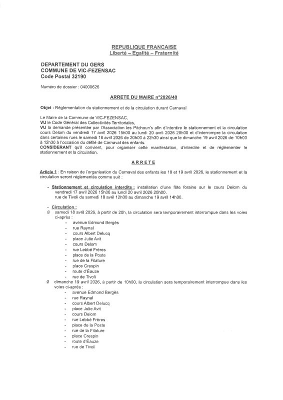 12-03-2026 - Arrêté n°2026/40 - Carnaval Des Enfants (diverses voies)