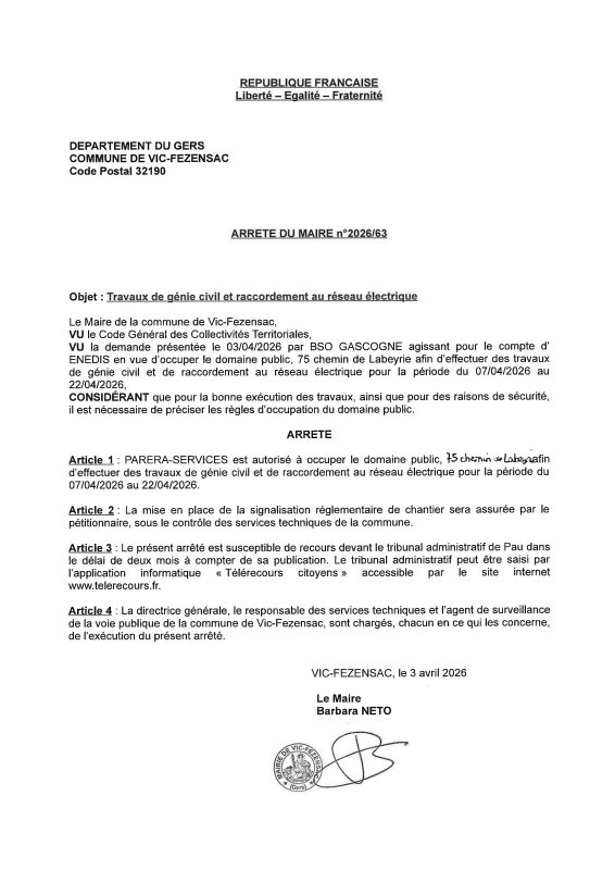 03-04-2026 - Arrêté n°2026/63 - Travaux de génie civil et de raccordement au réseau électrique (chemin de Labeyrie)