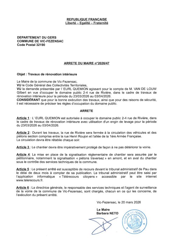 20-03-2026 - Arrêté n°2026/47 - Travaux de rénovation intérieure (rue de Rivière)