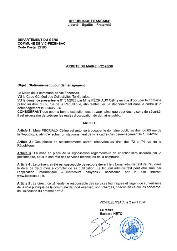 02-04-2026 - Arrêté n°2026/58 - Stationnement pour déménagement (rue de la République)