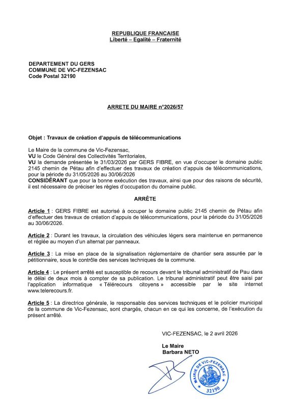 02-04-2026 - Arrêté n°2026/57 - Travaux de création d'appuis de télécommunications (chemin de Pétau)