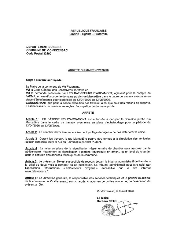 09-04-2026 - Arrêté n°2026/66 - Travaux sur façade (rue Marcadère)