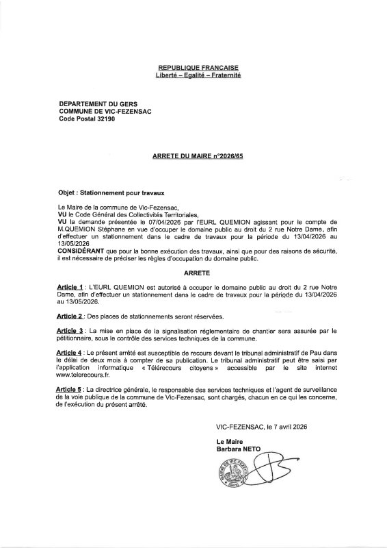07-04-2026 - Arrêté n°2026/65 - Stationnement pour travaux (rue Notre Dame)
