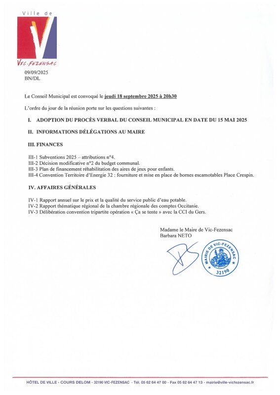 13-03-2025 : Ordre du jour - Conseil Municipal du jeudi 20 mars 2025