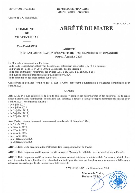 2024-DG33 Portant autorisation d'ouverture des commerces le dimanche pour l'année 2025