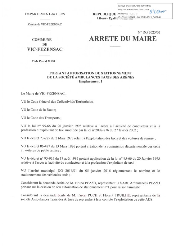 2025-01-23 - Portant autorisation de stationnement de la société Ambulances Taxis des Arènes Emplacement 1