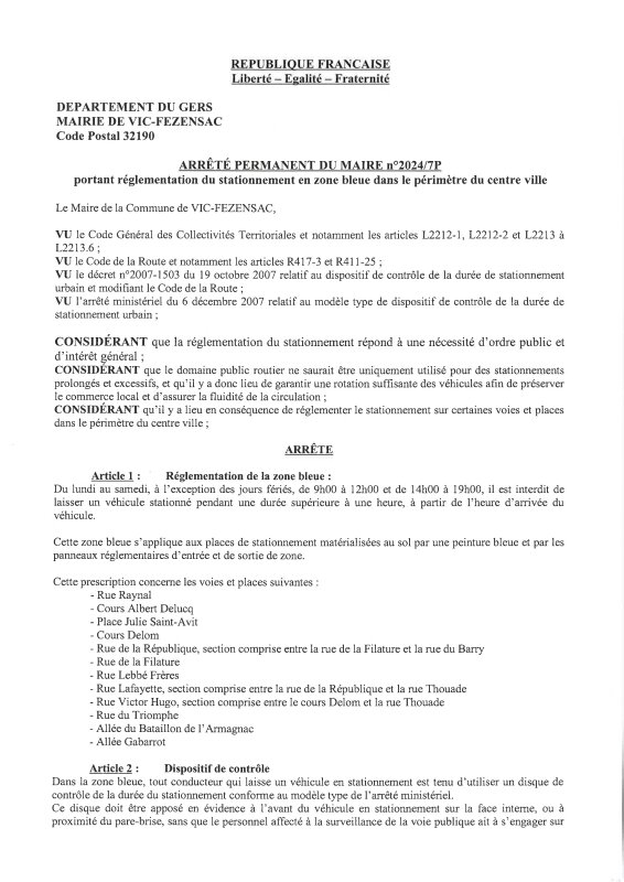 2024-7P Réglementation Stationnement Zone Bleue Centre Ville