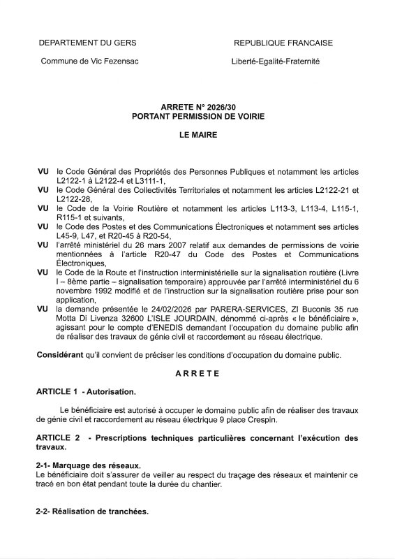 03-03-2026 - Arrêté n°2026/30 -portant permission de voirie - Travaux de génie civil et raccordement au réseau électrique (place Crespin)