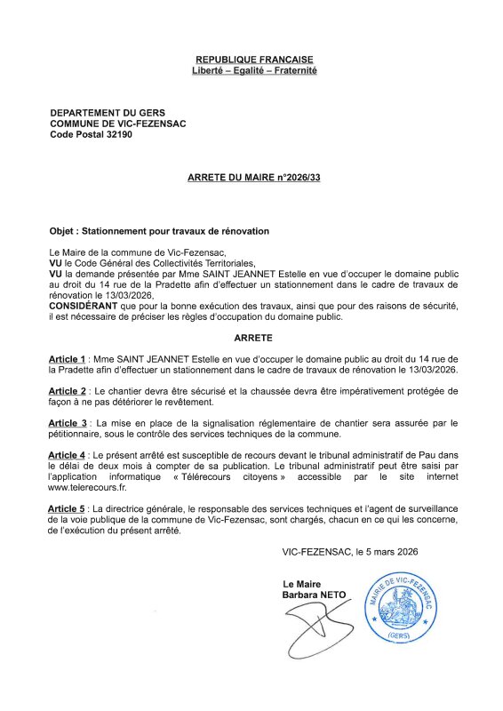 05-03-2026 - Arrêté n°2026/33 - Stationnement pour travaux de rénovation (rue de La Pradette)