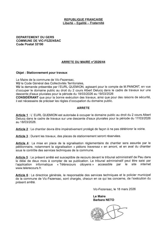 18-03-2026 - Arrêté n°2026/44 - Stationnement pour travaux (2 cours Albert Delucq)