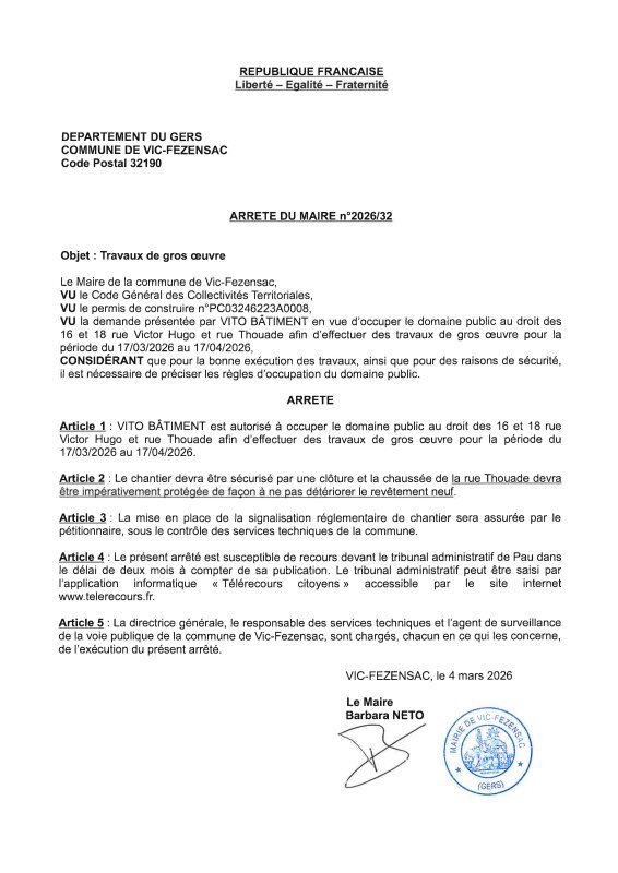 04-03-2026 - Arrêté n°2026/32 Vito Bâtiment - Travaux de gros œuvre (rue Victor Hugo et rue Thouade)