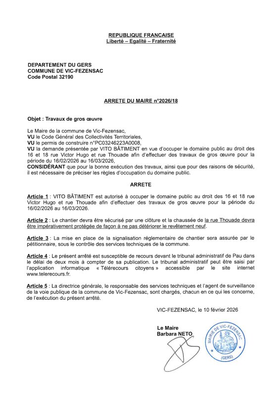 10-02-2026 - Arrêté n°2026/18 - Travaux de gros œuvre (rue Victor Hugo et rue Thouade)