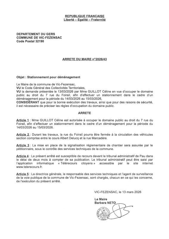 13-03-2026 - Arrêté n°2026/43 - Stationnement pour déménagement (rue du Foirail)